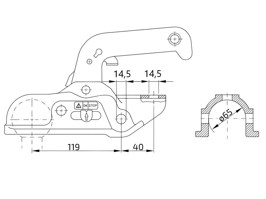 AL-KO:n (Winterhoff) laadukas valurauta kuulakytkin 3500kg. 65mm pyöreälle putkelle, työntöjarruihin.